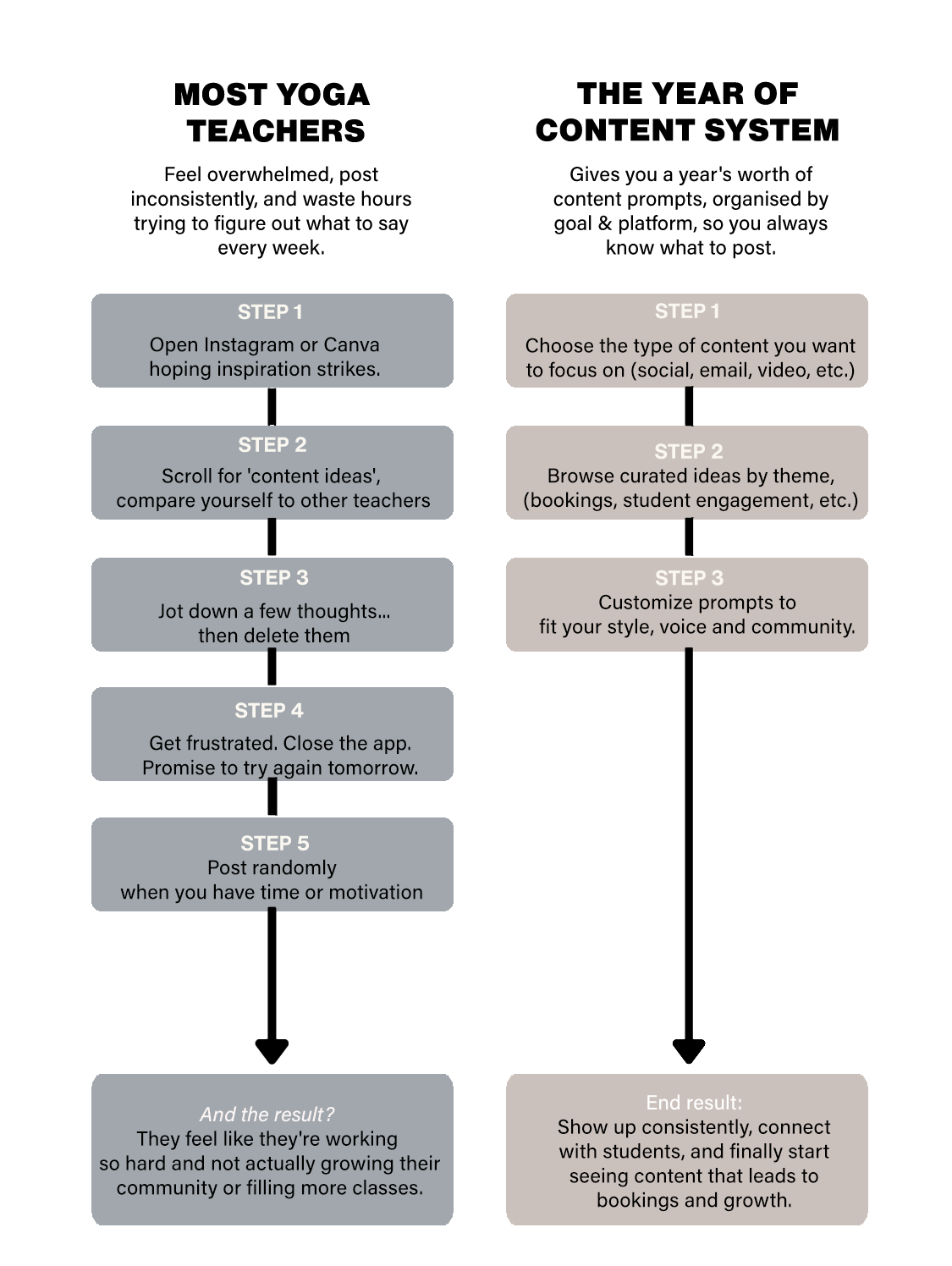 Once you access The Year of Content System for Yoga Teachers, you'll be able to stop doing all the energy-draining activities that don't get results—and start building the successful teaching career you're dreaming of.